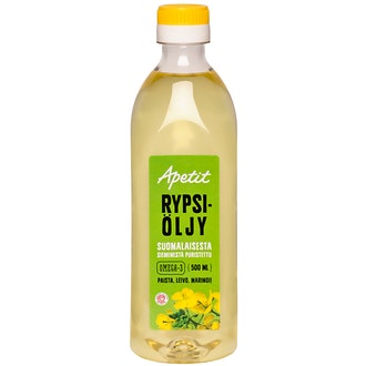 Apetit rypsiöljy on puristettu 100 % suomalaisesta raaka-aineesta. Rypsiöljy sisältää runsaasti omega-3-rasvahappoja ja E-vitamiinia.