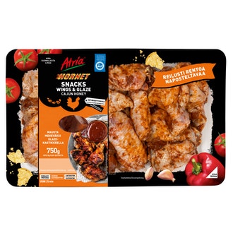 Atria 750g Hornet Snacks Wings & Glaze on valmistettu Suomessa.