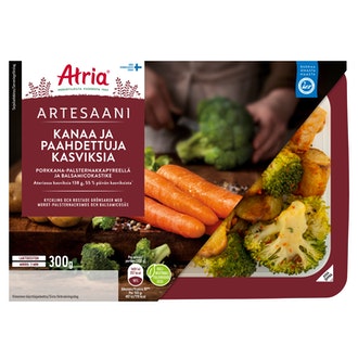 Atria Artesaani kanaa, paahdettuja kasviksia porkkana-palsternakkapyreellä ja balsamicokastike 300g sisältää 119 kilokaloria per 100g. Koko 300g pakkaus sisältää yhteensä 357 kcal.