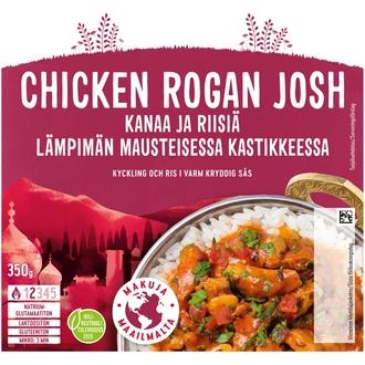 Pikantti Chicken Rogan Josh -ateria vie makumatkalle Intian Kashmiriin. Atrian Chicken Rogan Josh yhdistää Aasian mausteet ja suomalaisen kanan sekä riisin. Rogan Josh -kanakastike on mausteista ja sopii aikuiseen makuun. Chicken Rogan Josh -valmisateria lämmitetään kätevästi mikroaaltouunissa. Siitä saa myös siististi mukana kulkevan evään esimerkiksi työpaikalle.