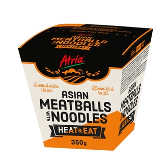 Atria heat & eat Asian meatballs with noodles 350g on valmistettu Suomessa.
