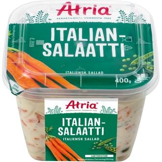 Italiansalaatti tunnetaan perinteisenä majoneesipohjaisena ruokaisana salaattina. Italiansalaatin valmistukseen on käytetty leikkelemakkaraa, spagettia, kananmunaa, keitettyä porkkanaa ja herneitä sekä suolakurkkua. Italiansalaatti sopii mainiosti lisukkeeksi grilliruoille ja lihalle. Kiinteän koostumuksen ansioista italiansalaatti sopii myös leivän päälle ja toimii nopeana ateriana tai osana runsasta brunssia. Atrian Italiansalaatti on laktoositonta ja käytetty liha on peräisin Suomesta. Italiansalaatti on tuttu termi meille suomalaisille. Kuitenkin muissa kielissä Italiansalaatilla tarkoitetaan perinteistä venäläisen keittiön Olivje -salaattia, jossa yleensä käytetään spagetin sijaan perunaa. Suomalaiset ovat kuitenkin käyttäneet nimeä Italiansalaatti jo vuosikymmenten ajan. Italiansalaatti on ruokaisa välipala, lisuke tai vaikkapa lounas. Valmispakattu Atrian Italiansalaatti kulkee mukana nopeana ja helppona eväänä. On kuitenkin hyvä huomioida, että Italiansalaatti tulee säilyttää jääkaapissa kuten muutkin majoneesipohjaiset salaatit.