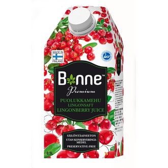 Bonne Premium puolukkamehujuoma 0,5l on valmistettu Suomessa.
