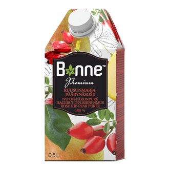 Bonne premium ruusunmarja-päärynäsose 100% 0,5l on valmistettu Suomessa.