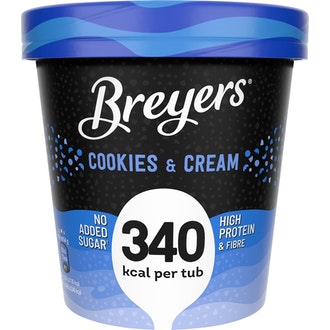 Breyers 465ml Cookies & Cream sisältää 73 kilokaloria per 100ml. Koko 465ml pakkaus sisältää yhteensä 339 kcal.