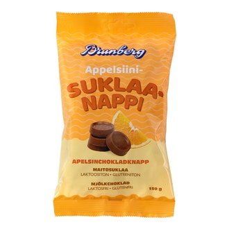 Brunberg Appelsiinisuklaanappi 150g on valmistettu Suomessa.
