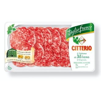 Citterio Salame Milano 70g sisältää 386 kilokaloria per 100g. Koko 70g pakkaus sisältää yhteensä 270 kcal.