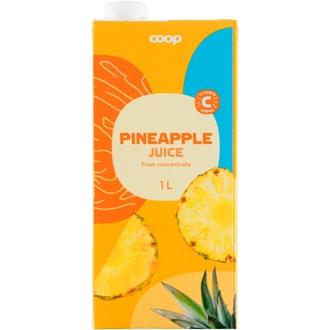 Coop-ananastäysmehu on 100 % täysmehua, johon on lisätty C-vitamiinia. Valmistettu tiivisteestä. Mehu on lisäaineeton.