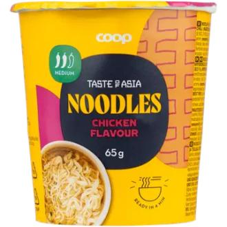Coop Asia kananmakuinen kuppinuudeli 65 g sisältää 73 kilokaloria per 100g. Koko 65g pakkaus sisältää yhteensä 47 kcal.