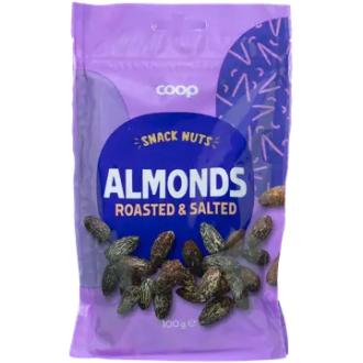 Coop paahdetut ja suolatut mantelit 100 g sisältää seuraavia ainesosia:
