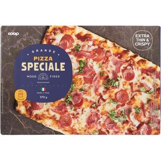 Coop Pizza Grande Speciale. Coop-pizzat on valmistettu perinteiseen italialaiseen tapaan Pohjois-Italian Emilia Romagnan alueella, joka on tunnettu vahvoista kulinaristisista perinteistään ja maukkaista ruuistaan. Laadukkaan pizzan autenttisen maun ja koostumuksen aikaansaamiseksi pizzataikinaa on kohotettu vähintään 24 tuntia. Sen jälkeen taikina muotoillaan ja levitetään käsin ainutlaatuiseen nelikulmaiseen muotoon, joka sopii uunipellille. Sen jälkeen pizza paistetaan tammi- ja pyökkipuilla lämmitetyssä kiviuunissa avotulen päällä. Käsin valmistetussa ja kiviuunissa paistetussa pizzassa on erittäin ohut ja rapea pohja. Coop Pizza Grande Speciale on kinkkua ja pepperonia sekä mozzarellaa sisältävä pizza.