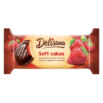Delisana Soft Cakes pehmeä leivoskeksi mansikka 135g mansikanmakuisella hyytelöllä (52%) suklaakuorrutteella. sisältää 47,0g sokeria per 100g. Tämä on melko paljon, joten suosittelemme käyttämään tuotetta kohtuudella.