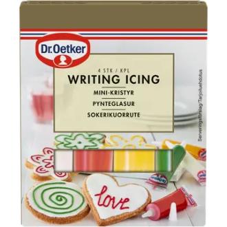 Kapeakärkiset sokerikuorrutteet punaisen, keltaisen, vihreän ja valkoisen väreissä tuovat tarkkuutta ja väriä leivontaan. Näiden helposti käytettävien tuubien avulla voit tehdä yksityiskohtaisia kuvioita, tekstejä ja reunuksia. Sopivat erinomaisesti piparkakkujen ja pikkuleipien koristeluun sekä cup cake -kuorrutusten, donitsien ja syntymäpäiväkakkujen persoonalliseen viimeistelyyn. Kuorrute kovettuu kuivuessaan.