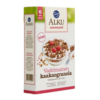 Fazer Alku annosmysli vadelmainen kaakaogranola 6x25g on valmistettu Suomessa.