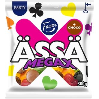 Fazer Ässä Megax +choco karkkipussi 300g sisältää 380 kilokaloria per 100g. Koko 300g pakkaus sisältää yhteensä 1140 kcal.