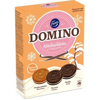 Fazer Domino 525G 3X13kpl Keksilajitelma Kausimaku, Kaakaokeksejä, Joissa Vaniljan-, Sitruunan Ja Kinuskin Makuista Täytettä on valmistettu Suomessa.