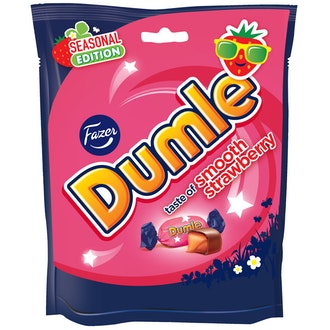 Dumle on iloinen klassikko, joka ei aikuistu koskaan. Maitosuklaalla kuorrutettu toffeekaramelli on maistuvan riemukas seuralainen, jota saa nyt pehmeän mansikan makuisena. Pussista riittää makua jaettavaksi myös kavereille. Valmistettu 100 % vastuullisesti tuotetusta kaakaosta.