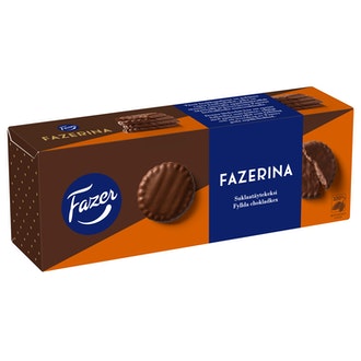 Fazerina-suklaakeksi kutsuu todelliseen herkutteluun. Fazer maitosuklaalla kuorrutetussa keksissä on viehkeä Fazerinan makuinen täyte. Keksiin käytetty suklaa on valmistettu 100 % vastuullisesti tuotetusta kaakaosta. Istahda nautiskelemaan suklaakeksi tai pari yksin tai ystävän kanssa.