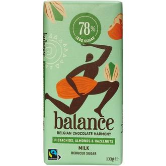 Balance maitosuklaalevy pistaasi-, manteli-, hasselpähkinä 100g, sisältää makeutusainetta