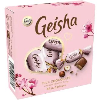Geisha Mini konvehtirasia on täydellinen pieni lahja jokapäivisiin lahjahetkiin. Suloinen pieni rasia sisältää kuusi kappaletta herkullisia Geisha-konvehteja, joissa pehmeä maitosuklaa kätkee sisäänsä rapean hasselpähkinänougat-täytteen. Noudatamme kaakaonhankinnassamme Fazerin kaakaovisiota. Lue lisää www.fazercocoavision.com.