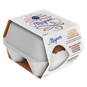 Mignon-muna, Fazerin ainutlaatuinen klassikko vuodelta 1896, kruunaa pääsiäisen. Aitoon kananmunankuoreen käsin valettu herkku sulkee sisäänsä suussa sulavan mantelipähkinänougattäytteen. Mikä parasta, Mignon-munan valmistuksessa on käytetty 100 % vastuullisesti tuotettua kaakaota. Koristele Mignon oman makusi mukaan, kuori ja nauti! Vie Mignon-muna ihanaksi keväiseksi lahjaksi tai varaa munia virpojia varten.