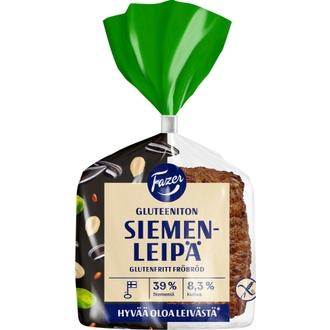 Fazer Siemenleipä Gluteeniton on leivottu täysin ilman gluteenia. Lisäksi leivässä yli puolet gluteenittomista jauhoista on korvattu siemenillä ja jyvillä. Fazer Siemenleipä Gluteeniton on hyvä proteiinin, kuitujen sekä omega-3-rasvahappojen lähde. Runsaskuituisessa leivässä on peräti 8,4 % kuitua, Leivässä ei ole lisättyä sokeria ja se on laktoositon. Soveltuu FODMAP-ruokavalioon, kuten useimmat gluteenittomat tuotteet.