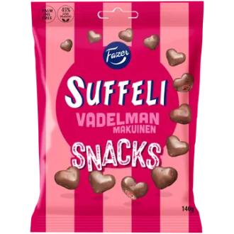 Suffeli on rapea klassikko, joka on ihastuttanut jo vuodesta 1966. Vadelmanmakuiset Suffeli Snacksit ovat rapeita ja kevyitä vehnäsydämiä suklaanmakuisella kuorrutteella. Nauti puffeista itse tai jaa pussi ystävien kanssa!