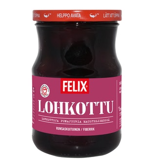 Felix® Lohkopunajuuret on valmiiksi lohkottuja, käytössä käteviä ja aina yhtä herkullisia punajuuria. Vinkki: lohkotuista punajuurista ja sinihomejuustosta saa loihdittua maukkaan paistoksen. Joten uuni kuumaksi ja kokeilemaan. Toki lohkopunajuuret maistuvat myös sellaisenaan ruuan kuin ruuan oheen. Felix punajuuret ovat myös terveellinen vaihtoehto, sillä ne ovat runsaskuituisia ja nille on myönnetty Sydänmerkki. Tuote on säilöntäaineeton ja se sopii vegaanista ruokavaliota noudattavalle. Lisäksi purkissa on helppo avata -kansi, joka lisää käyttömukavuutta. Felix - herkkuja ruokapöytäään®.