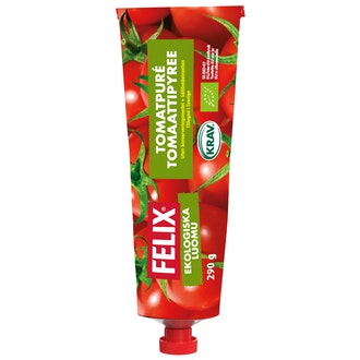 Felix® luomutomaattipyreellä saa helposti maukasta tomaattisuutta pizzan pohjalle, keittoihin, patoihin ja kastikkeisiin. Kätevä tuubi helpottaa annostelua ja pakkaus säilyy siistinä jääkaapissa säilytettynä myös seuraavaa käyttökertaa varten. 100 g Felixin luomutomaattipyreetä vastaa 470 g tuoreita luomutomaatteja. Tuote sopii myös vegaaniseen ruokavalioon. Lue lisää felix.fi. Felix - herkkuja ruokapöytään®.