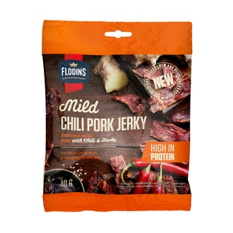 Kyllä, Flodins mild chili pork jerky 40g sisältää 45,0g proteiinia per 100g, mikä tekee siitä hyvän proteiinin lähteen.