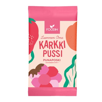 Foodin luonnon oma karkkipussi Punaposki 40g on valmistettu Suomessa.