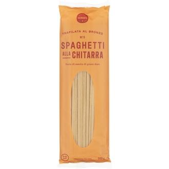 Herkku Spaghetti alla chitarra -durumpasta, pasta no. 5. Pasta on painettu muotoonsa käyttämällä pronssista valmistettuja suuttimia, josta kertoo merkintä “trafilata al bronzo”. Pronssisuuttimia käyttämällä pastan pinnasta tulee karhea ja rosoinen. Silloin kastike tarttuu paremmin pastaan ja pasta on maukkaampaa. Spagetti sopii parhaiten ohuiden kastikkeiden seuraksi.