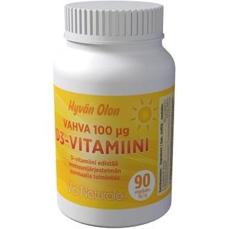 HYVÄN OLON VAHVA D3-VITAMIINI 100 µg / 36,7 G 90 VEGEKAPS D3 - vitamiinivalmiste, ravintolisä. Vahva ja monipuolinen D3 -vitamiini yhdistettynä E-vitamiiniin. D-vitamiini (kolekalsiferol) valmistetaan lampaanvillasta. Vegekapseli. D3 -vitamiini edistää: * immuunijärjestelmän normaalia toimintaa * veren normaalia kalsiumtasoa