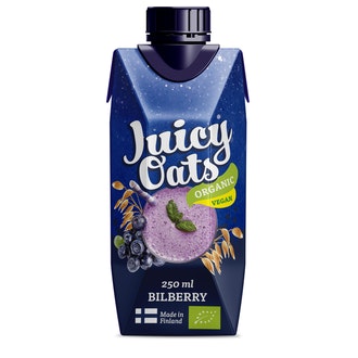 Juicy Oats mustikka-kaurajuoma 250ml luomu on valmistettu Suomessa.