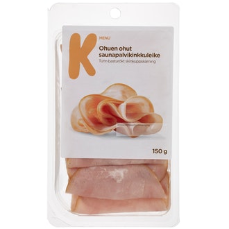 K-Menu ohuen ohut saunapalvikinkkuleike 150g on valmistettu Suomessa.