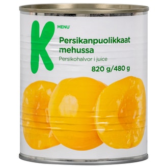 K-Menu persikanpuolikkaat mehussa 820g/480g sisältää seuraavia ainesosia:
