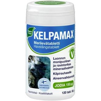Meren monipuoliset ravinteet, vitamiinit, mineraalit ja aminohapot ovat tiivistyneet Skotlannin merivesien solmuleviin (kelp). Ravintorikas Kelpamax merilevävalmiste sisältää jodia vakioidun määrän 150 µg/tabl. Jodi edistää kilpirauhashormonien normaalia tuotantoa, kilpirauhasen ja hermoston normaalia toimintaa, energia-aineenvaihduntaa sekä ihon hyvinvointia. Annostus: 1 tabletti päivässä. Laktoositon, hiivaton, makeuttamaton ja gluteeniton. Ei sisällä eläinperäisiä ainesosia. Valmistettu Suomessa.