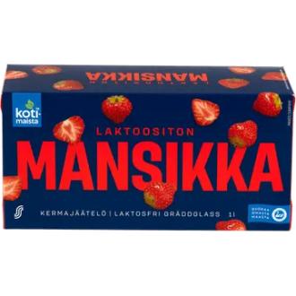 Kotimaista laktoositon kermajäätelö kotipakkaus mansikka 1L/520g on valmistettu Suomessa.