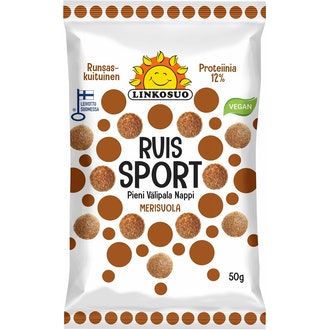 Linkosuo Ruis Sport 50g merisuola sisältää 370 kilokaloria per 100g. Koko 50g pakkaus sisältää yhteensä 185 kcal.