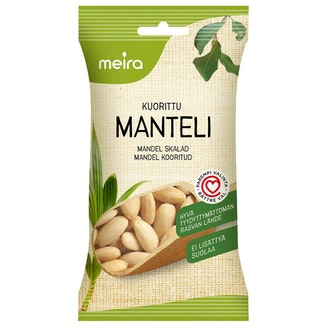Manteli on mainio välipala- ja napostelupähkinä. Se sopii hyvin myös makeisiin ja suolaisiin leivonnaisiin sekä erilaisiin salaatteihin ja pataruokiin. Manteli on runsaskuituinen, proteiinipitoinen ja hyvä tyydyttymättömän rasvan lähde. Meira Manteli ei sisällä lisättyä suolaa. Huolella valikoidut Meira mantelit pakataan Suomessa.