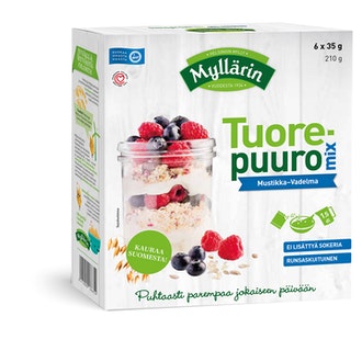 Myllärin tuorepuuro mix 6x35g mustikka-vadelma on valmistettu Suomessa.