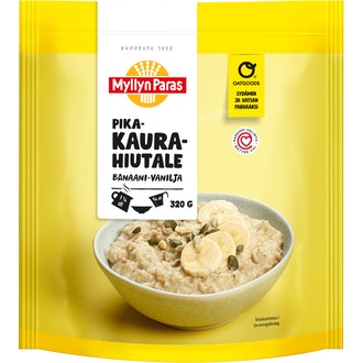Myllyn Paras Oatgoods pikakaurahiutale 320g banaani vanilja on valmistettu Suomessa.