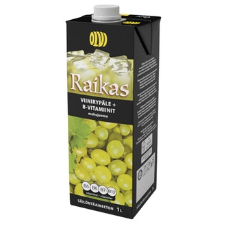 OLVI Raikas Viinirypäle + B-vitamiinit–mehujuoma rypäleenmakuinen juoma, joka sisältää B5-, B6-, B7- ja B12-vitamiineja, jotka edistävät kehon hyvinvointia. Mehujuomaan ei ole lisätty säilöntäaineita eikä keinotekoisia makeuttajia.