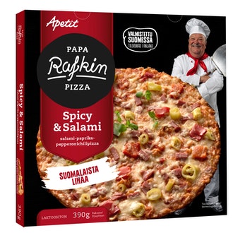 Papa Rafkin pizza Spicy&Salami 390g pakaste on valmistettu Suomessa.