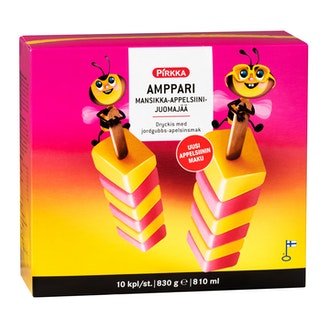 Pirkka Amppari mansikka-appelsiinijuomajää 10kpl/830g on valmistettu Suomessa.