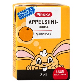 Pirkka appelsiinijuoma 2 dl on valmistettu Suomessa.