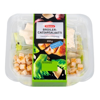 Pirkka broiler-caesarsalaatti 200g sisältää 149 kilokaloria per 100g. Koko 200g pakkaus sisältää yhteensä 298 kcal.