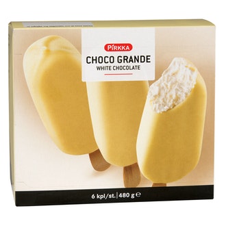 Pirkka Choco Grande valkosuklaa 6kpl/480g sisältää 318 kilokaloria per 100g. Koko 480g pakkaus sisältää yhteensä 1526 kcal.