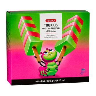 Pirkka juomajääpuikko monipakkaus Toukkis 10x83g vadelma-päärynä on valmistettu Suomessa.