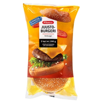 Pirkka juustoburgeri 280g (2x140g) on valmistettu Suomessa.